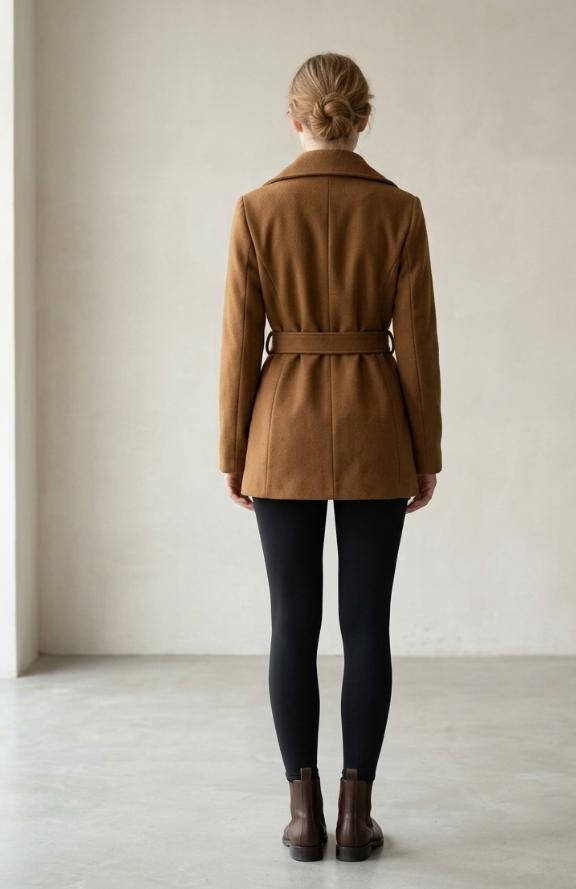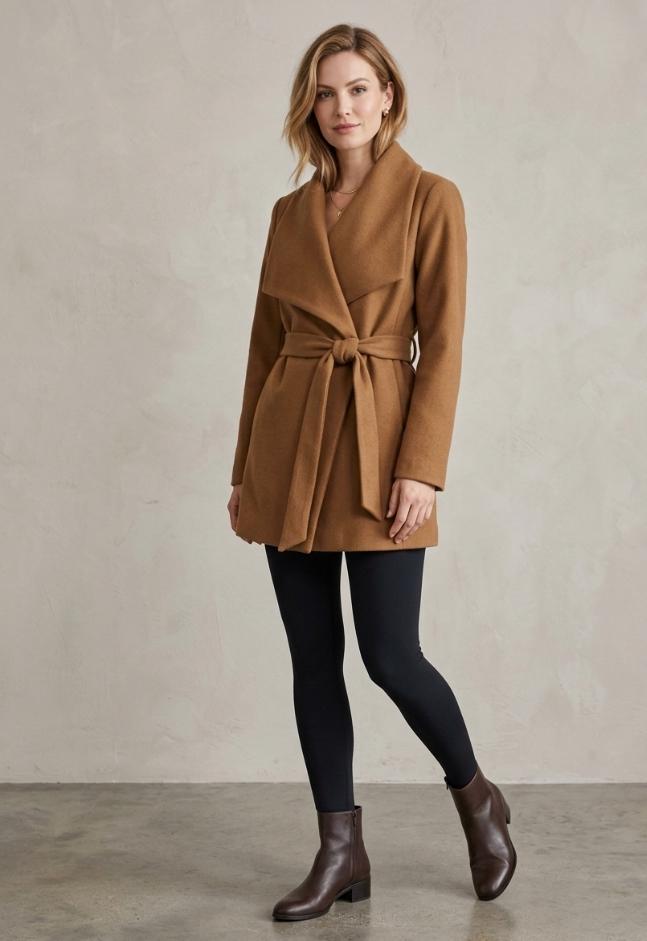 Hermoso abrigo café de diseño elegante con solapas amplias y cinturón ajustable que ayuda realzar la silueta, diseño exclusivo de la tienda
