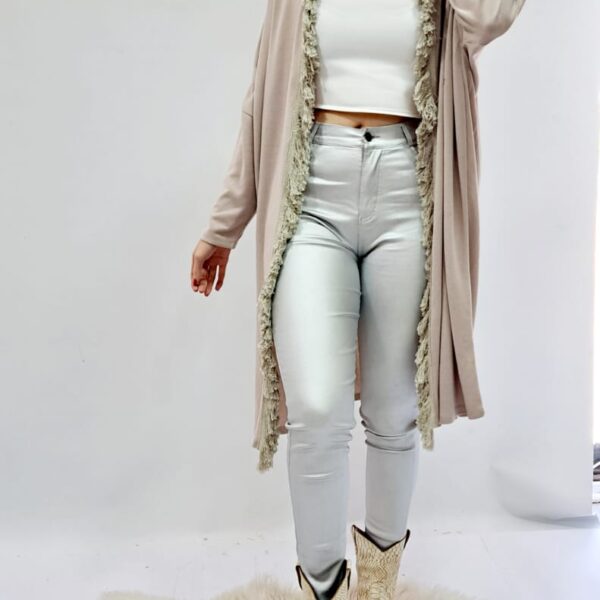 Lindo tapado de lanilla media en tono beige, es talla única con mangas murciélago, tiene un detalle en todo el delantero de flecos, muy lindo