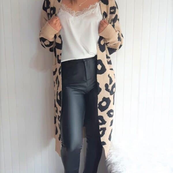 Hermoso Chalecon abierto tipo abrigo, de lana gruesa de excelente calidad en color beige con estampado animal print en negro . Tipo abrigo