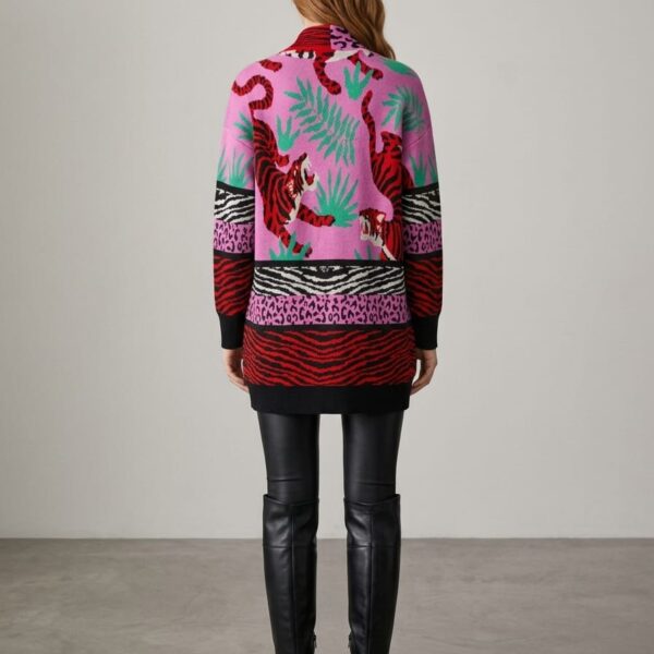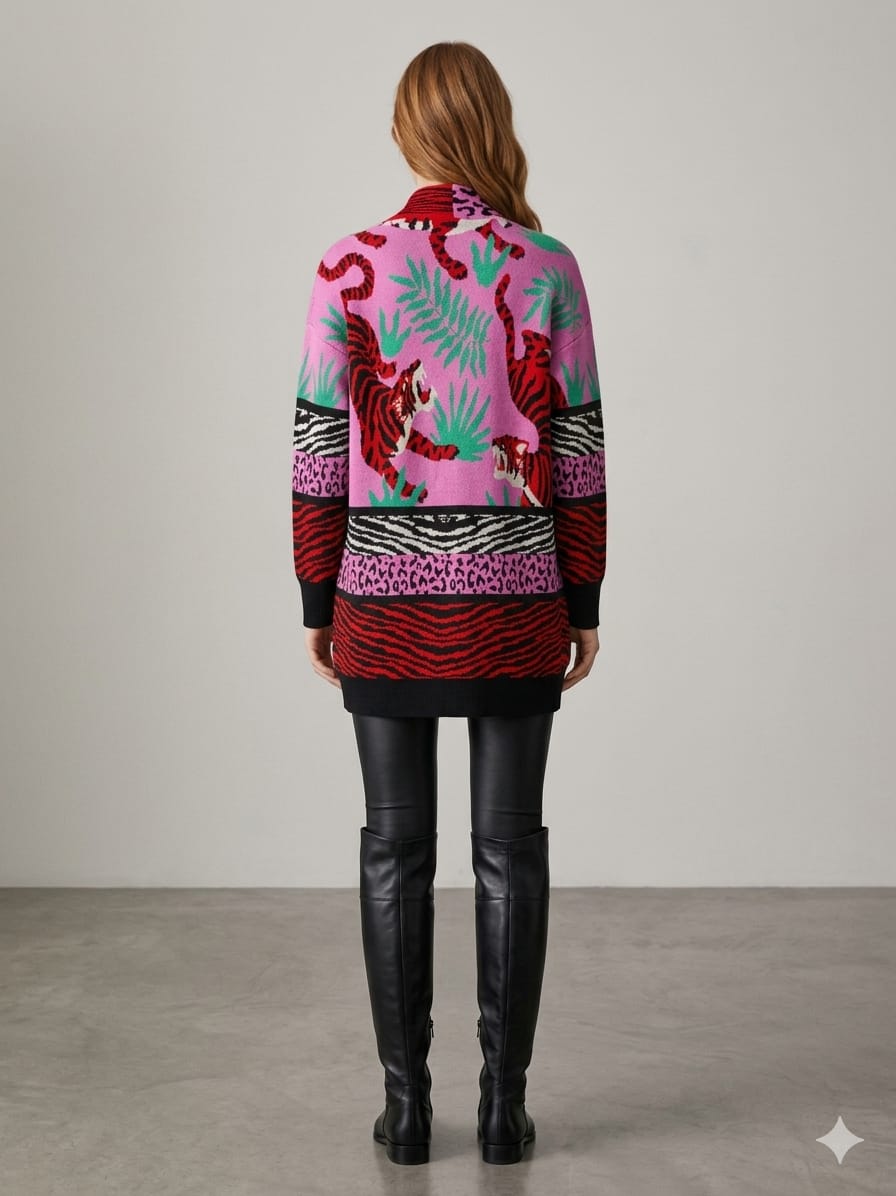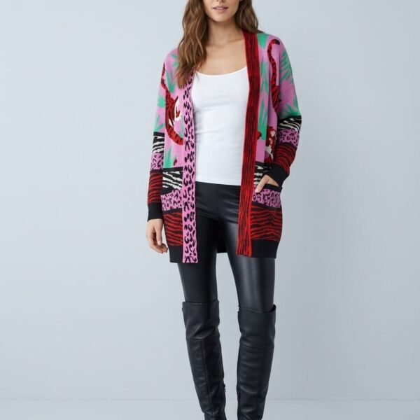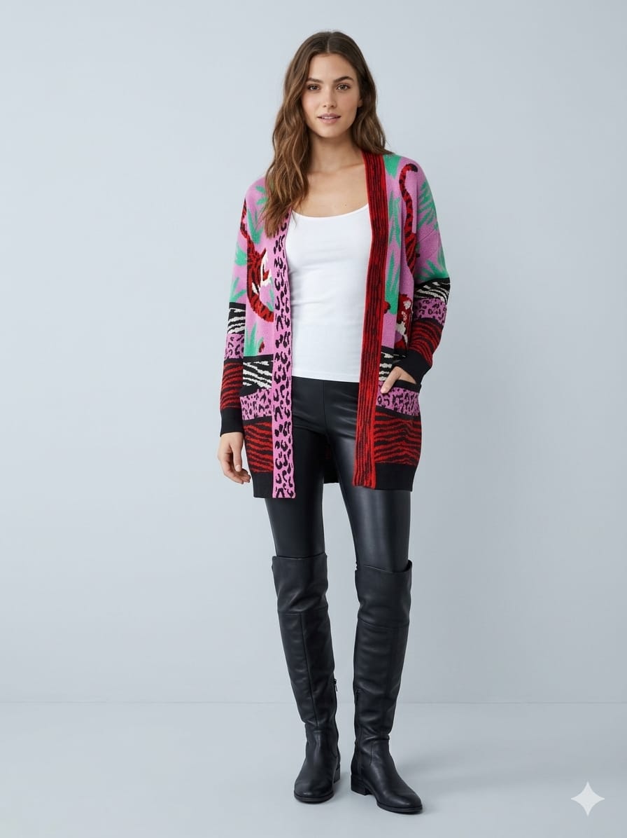 Hermoso chalecón abierto de tejido grueso, con colorido estampado en animal print en tonos fuscia, rojo,verde,blanco y negro . Largo 75 cms.