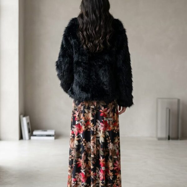 Hermosa Chaqueta de Piel sintetica gruesa en color negro. Tiene Cuello solapa grande, broches y bolsillos, que haran que tu look sea abrigador y glamuroso.