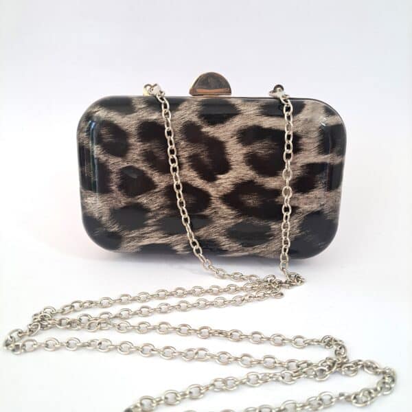 Hermoso Clutch animal print plata con cadena removible.