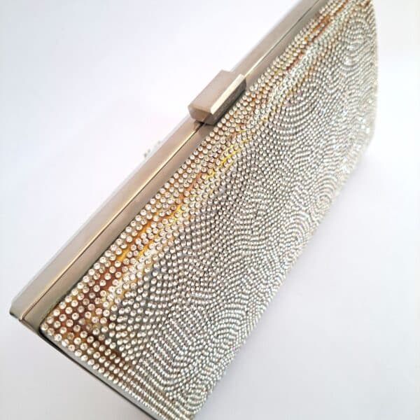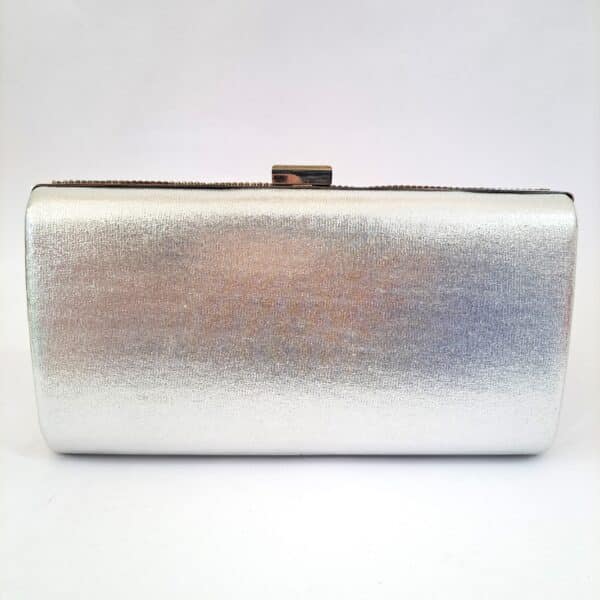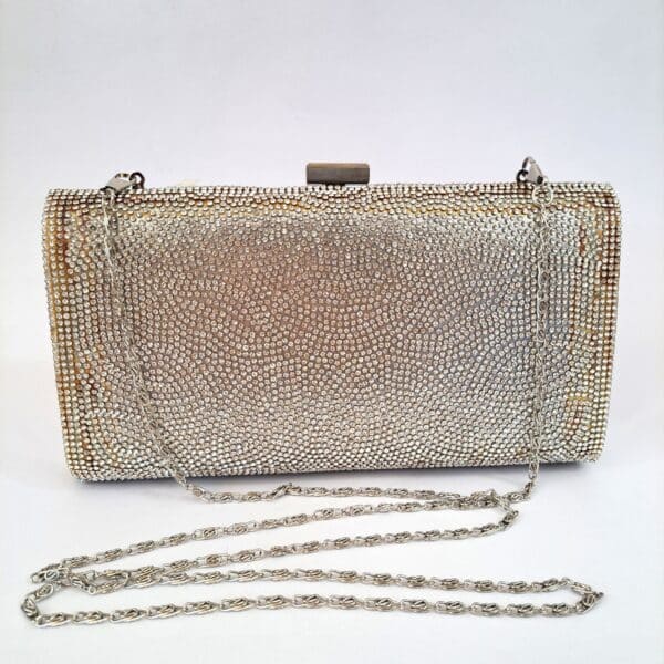 Hermoso Clutch de Fiesta Plata con Strass, posee amplio broche , con cadena que puedes poner y sacar según tu elección.