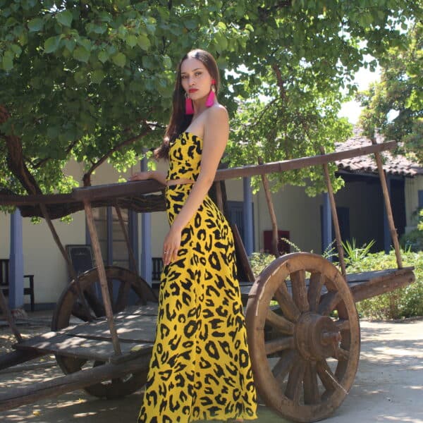 Bello y ondero conjunto de Crop top y falda tipo gitana en estampado animal print amarillo con negro. Diseño exclusivo de nuestra marca