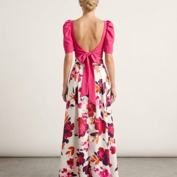 Hermoso diseño de croptop con escote entrelazado en tono fucsia con mangas abullonadas y lazo para amarre en la cintura, Diseño exclusivo de nuestra tienda