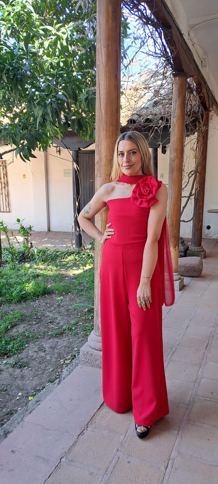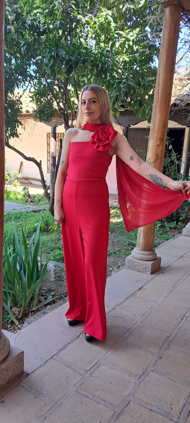 «Enterito exclusivo de nuestra marca. diseño elegante en tono rojo intenso, confeccionado en tela de caída fluida que estiliza la silueta, con ajuste al cuerpo en la parte superior. Presenta escote halter asimétrico con delicada maxi flor decorativa e incluye un tapado de gasa shiffon del mismo tono.»