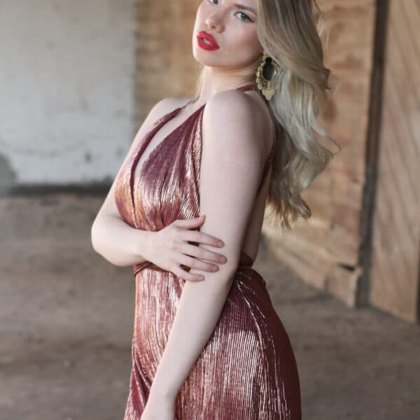 Enterito con tiras multi formas en tono rosa metalizado, con pata ancha.