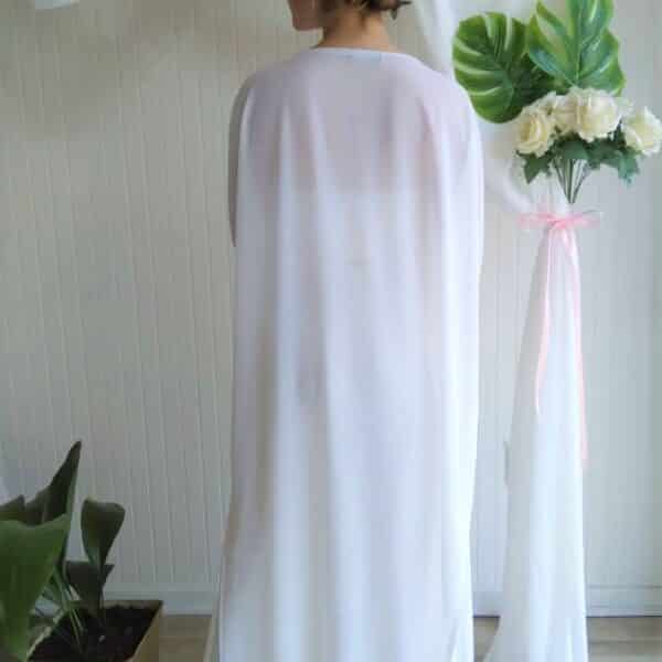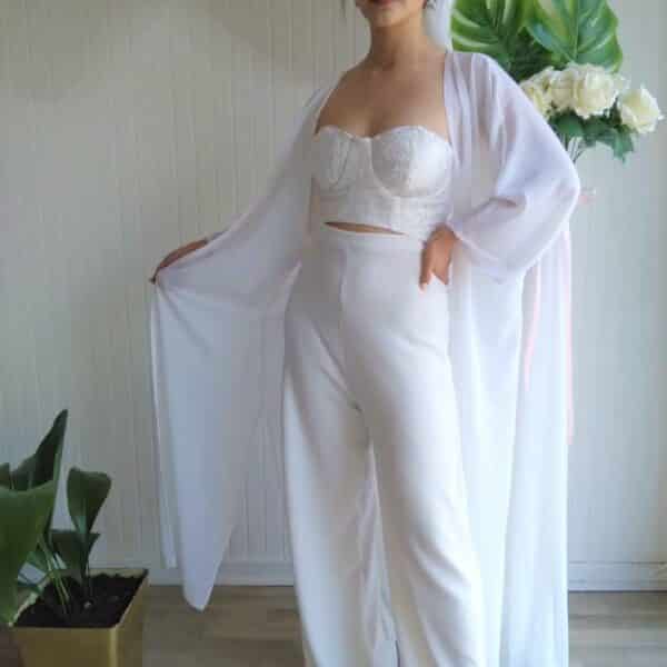 Bello Kimono de gasa, color blanco , con exquisita caída. Aberturas laterales , largo hasta el tobillo
