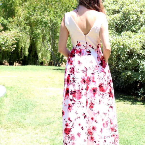 Maravilloso Maxi Vestido, en tela Poli Seda Piel de ángel, con color rosa claro de fondo y estampado de rosas, precioso! Diseño exclusivo de nuestra marca NOM. Faldón con tabla y bolsillos