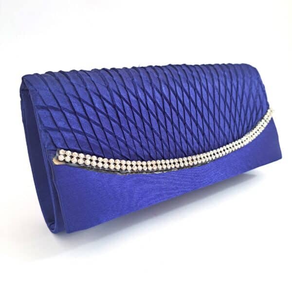 Hermoso sobre de Fiesta azul de tela con detalles en Strass, con cadena que puedes poner y sacar según tu elección.