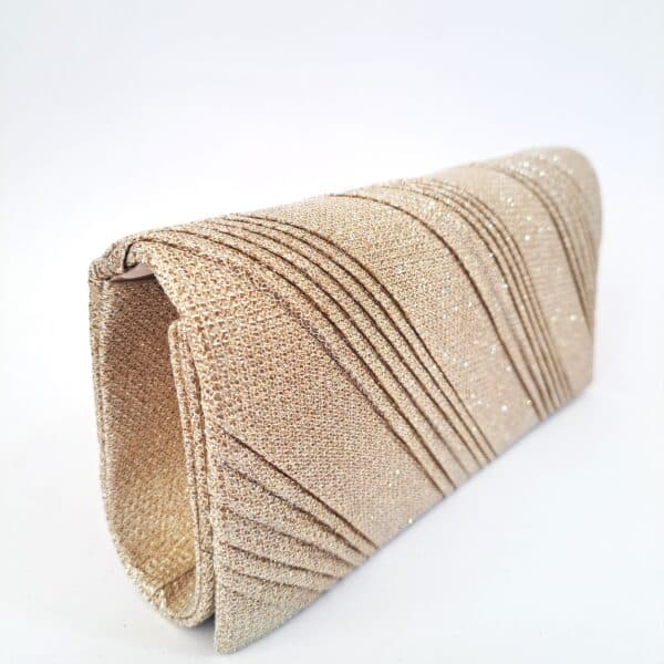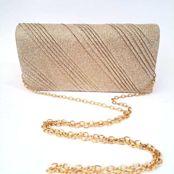 Hermoso sobre de fiesta dorado brillante con cadena que puedes poner y sacar según tu elección.