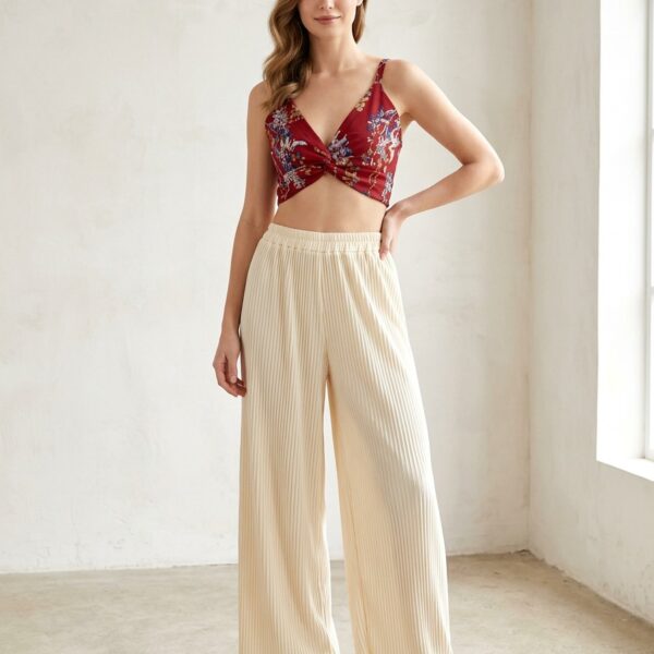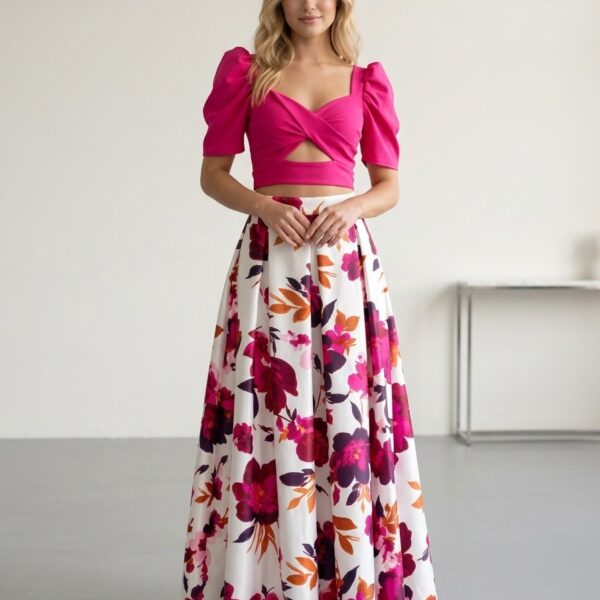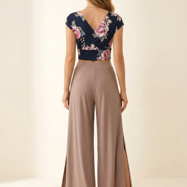 Hermoso top tipo crop con escote en v y diseño cruzado, estampados floral sobre fondo azul marino, diseño exclusivo de la tienda