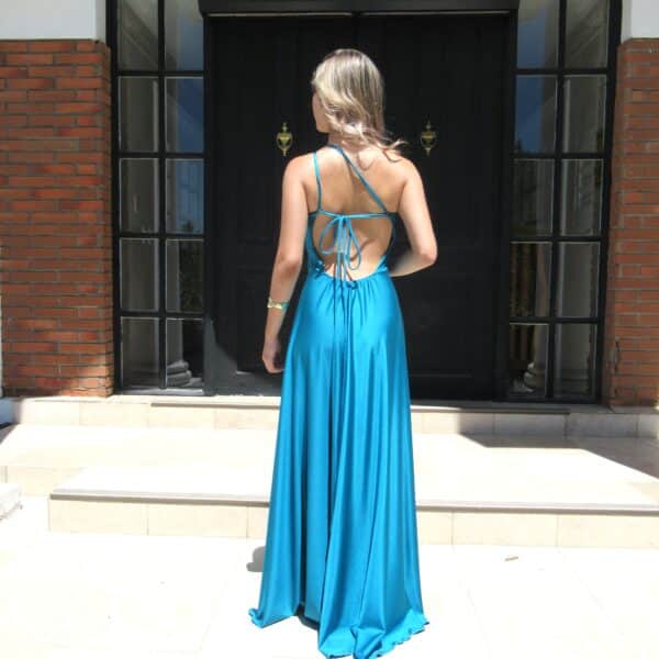 Hermoso vestido turquesa, largo y fluido, con escote asimétrico, un tirante y un corte en forma de lágrima en el pecho. Sin espalda. Ajustado en la cintura y con falda amplia. Fabricado con tela Lycra Dupont.