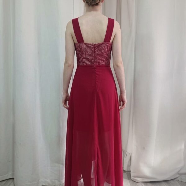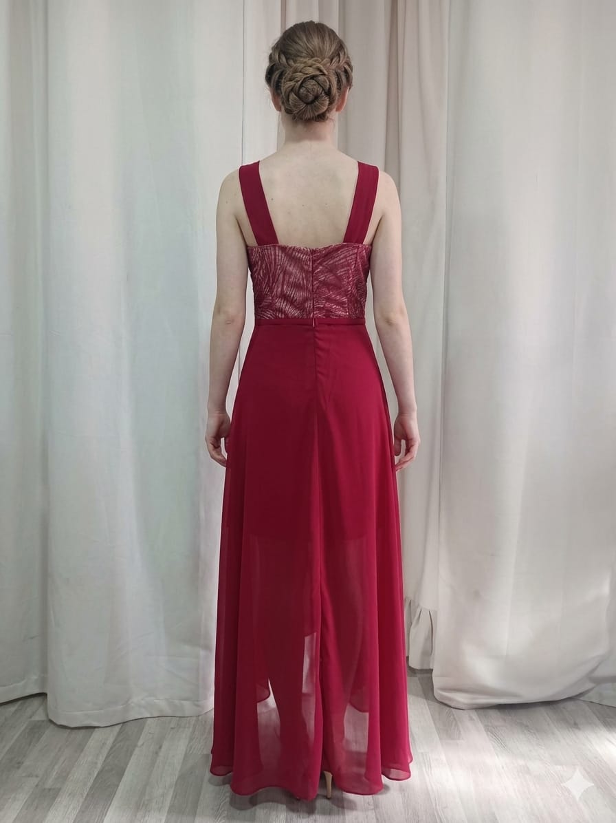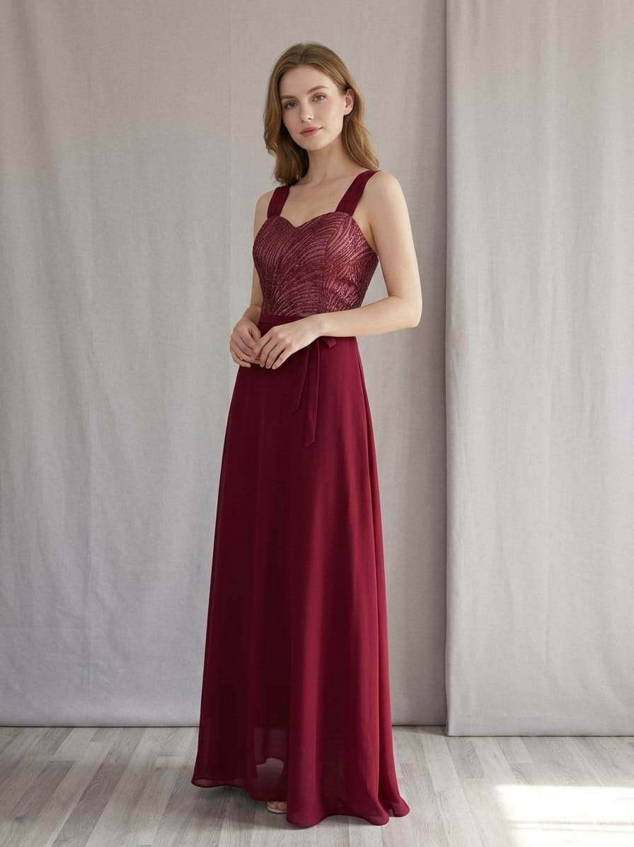 Vestido largo en tono burdeos,con delicado corset estructurado de textura brillante que realza la figura y aporta elegancia ,falda fluida con caida suave y lazo decorativo en la cintura.