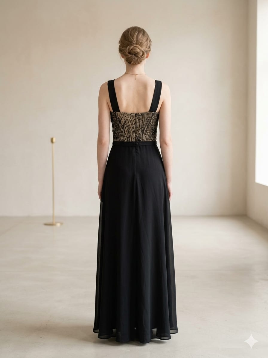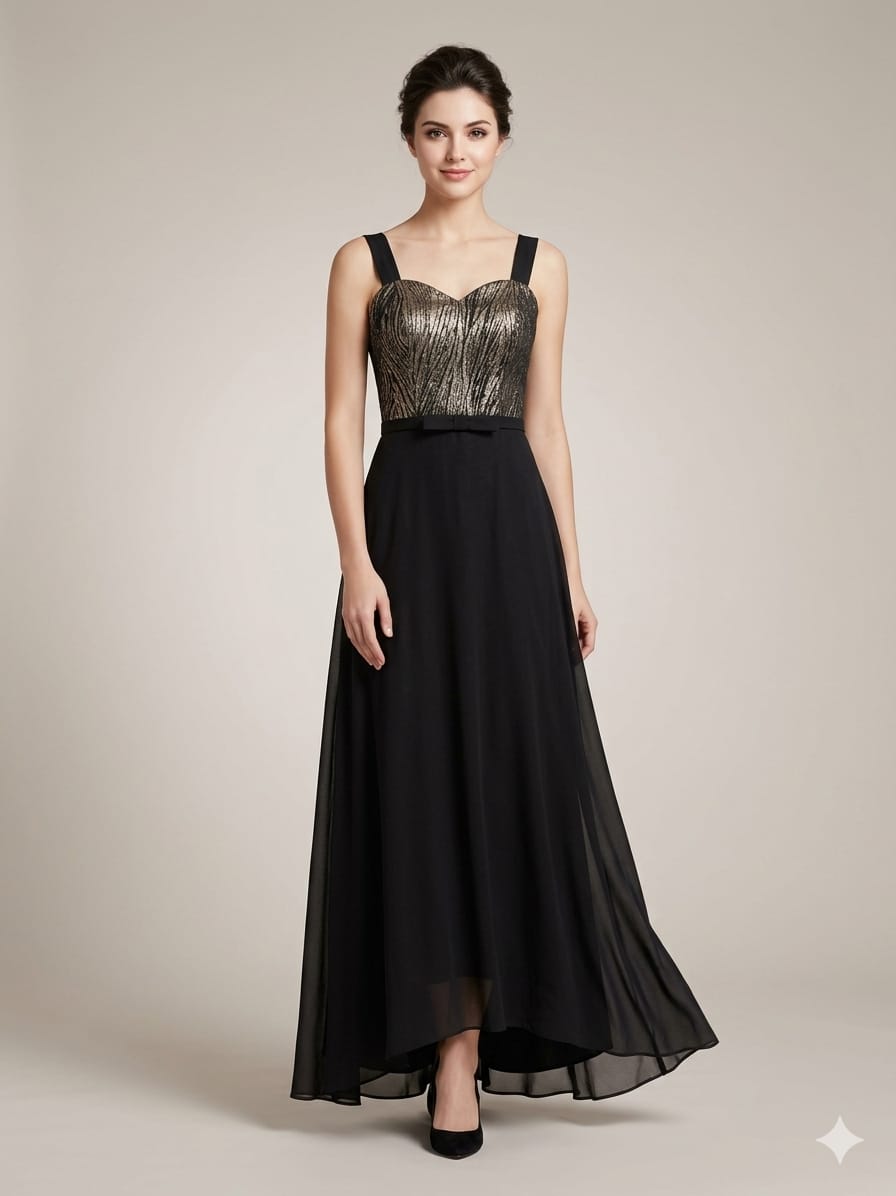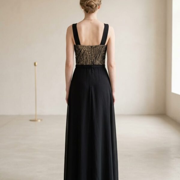 Vestido largo en tono negro,con delicado corset estructurado de textura brillante que realza la figura y aporta elegancia ,falda fluida con caida suave y lazo decorativo en la cintura.