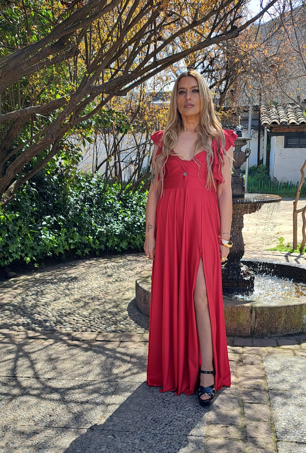 Vestido largo rojo de diseño elegante, confeccionado en tela de caída fluida que realza la silueta. Presenta escote corazón, delicadas mangas con volantes y abertura lateral para un toque moderno y sofisticado.