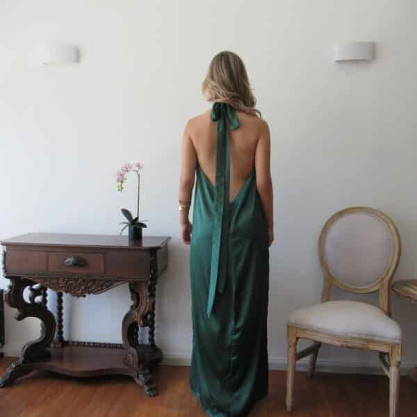 Hermoso vestido verde esmeralda, largo y fluido, con cuello halter y un corte en forma de lágrima en el escote, cae recto hasta el suelo. Sin espalda. Fabricado con Tela de Seda.