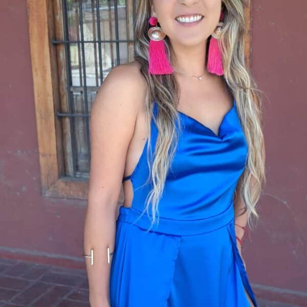 Hermoso Vestido en color azul Rey, de tela Satín, su escote es drapeado con tirantes que se anudan al cuello, espalda totalmente escotada con tiras que se anudan , bello! Falda amplia con doble abertura en las piernas, hermosa caída y movimiento.