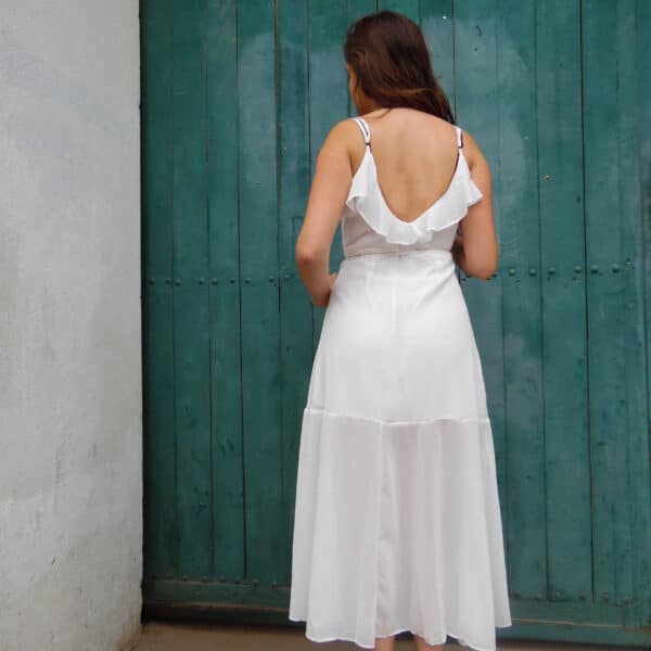 Hermoso y delicado vestido de gasa envolvente color blanco , con vuelos en parte superior y falda , se adapta al cuerpo con su forma envolvente