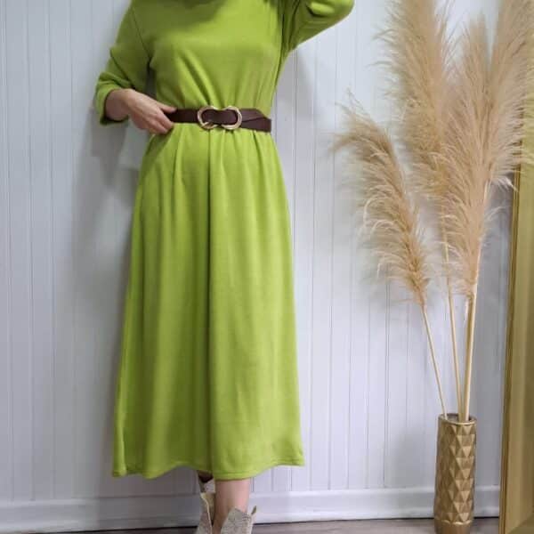 Hermoso y suave vestido largo de lanilla suave tipo Cashmire, de color verde pistacho, silueta ancha lo que te permite usarlo suelto o con cinturón. Manga larga, exquisito