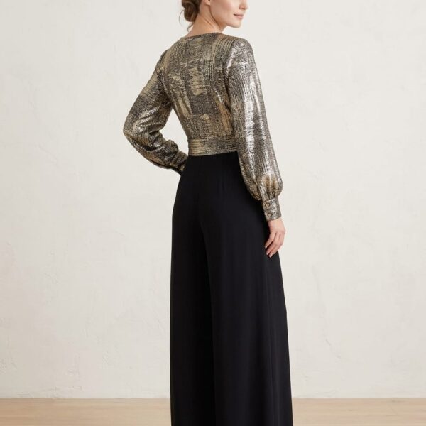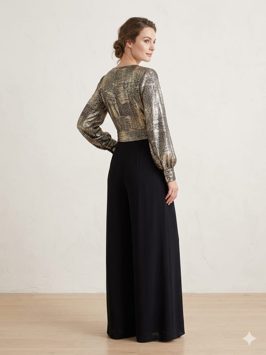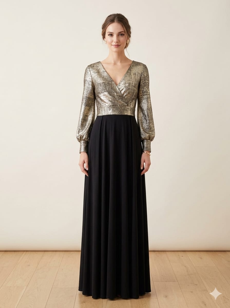 Hermoso vestido con escote cruzad0 y mangas largas ,falda caida fluida ,vertido en tono metalizado y negro.