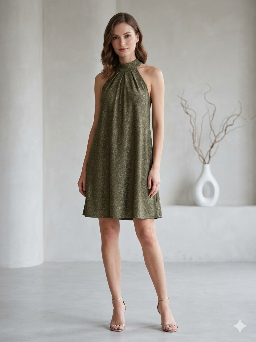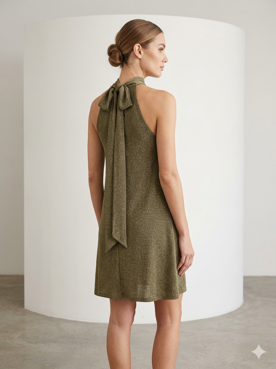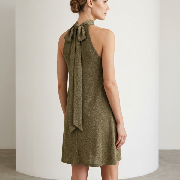 Hermoso vestido diseño halter con lazo en el cuello para su amarre en tono dorado brillante, diseño exclusivo de nuestra tienda.