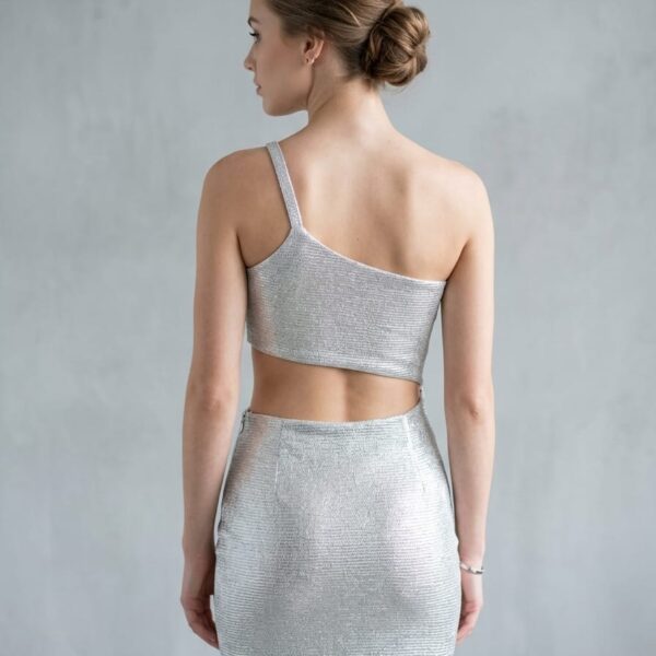 Vestido mini con estilo moderno y sensual, diseño asimetrico de un solo hombro con tirante, confeccionada en tela plateada con acabado brillante tipo metalico,diseño exclusivo de la tienda.