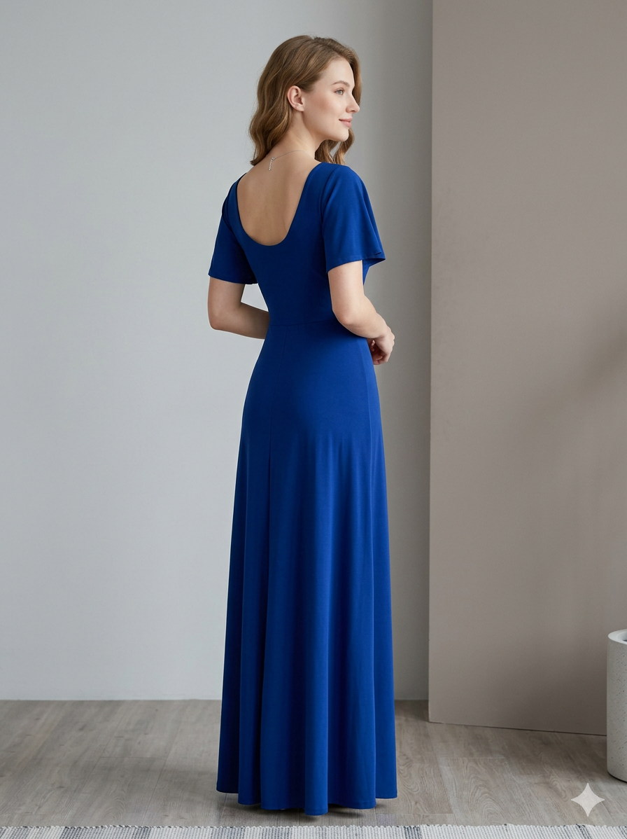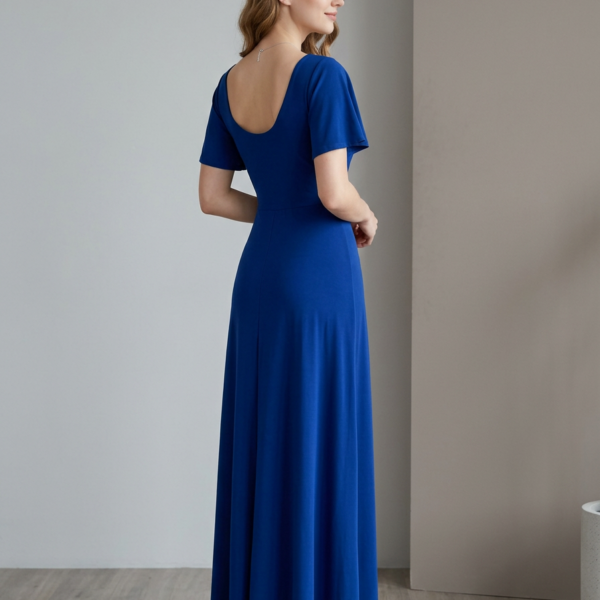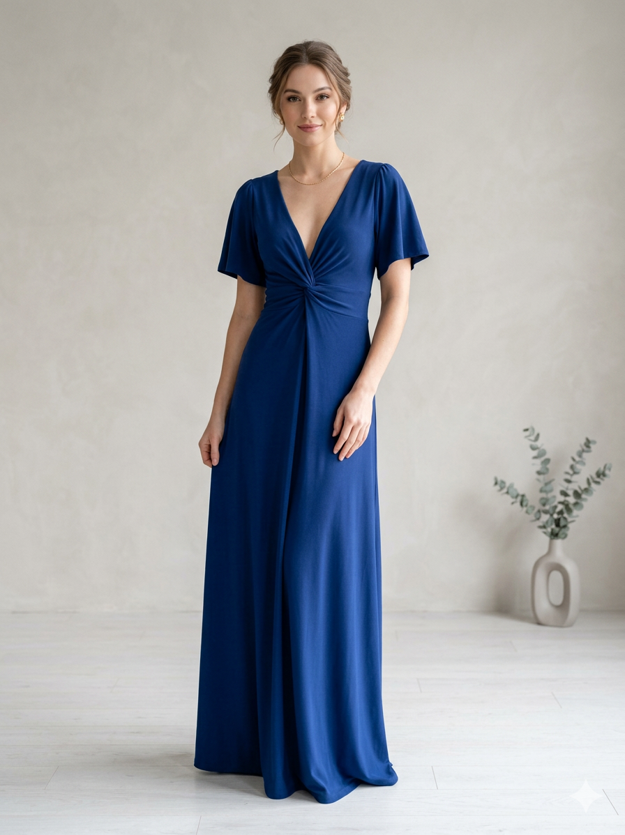 Hermoso vestido diseño nudo con escote en V y mangas holgadas, tela en tono azul, diseño exlusivo de nuestra tienda.