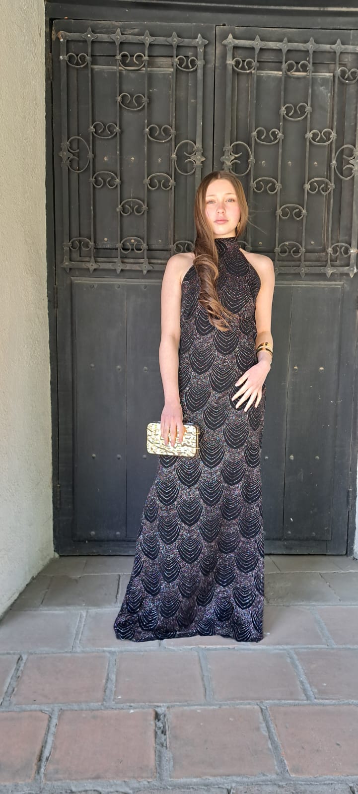 Vestido largo halter confeccionado en tela elasticada en tonos oscuros con brillo sutil. Su diseño de espalda descubierta y sin mangas realza hombros y cuello, mientras que la silueta ajustada estiliza la figura y la caída fluida aporta movimiento y elegancia. Ideal para eventos de noche y ocasiones especiales.