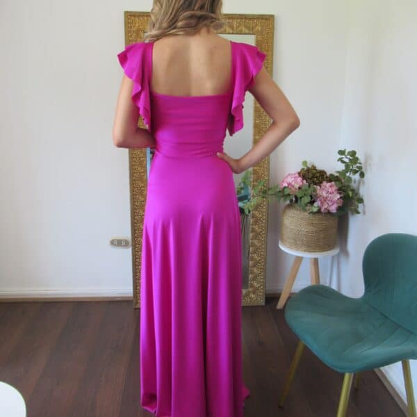 Hermoso vestido fucsia, largo y fluido, con escote de corazon anudado, posee mangas con doble vuelo y su espalda es rebajada. Ajustado en la cintura y con falda amplia. Fabricado con tela Lycra Dupont.