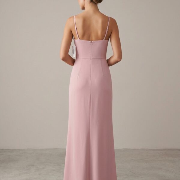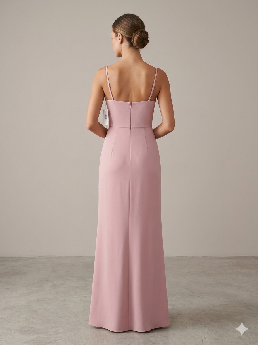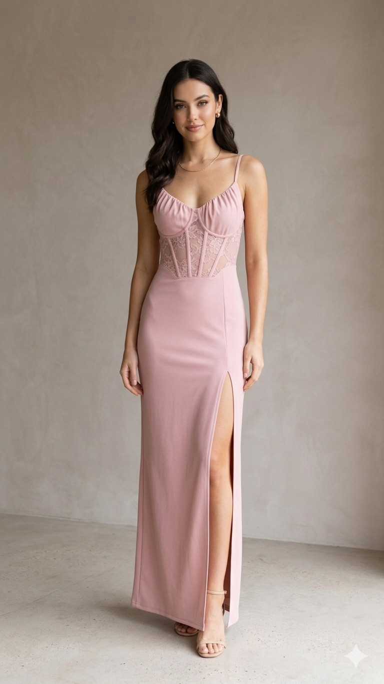 Vestido largo elegante en tono rosa con delicado encaje y corte que realza la silueta, ideal para ocasiones especiales.