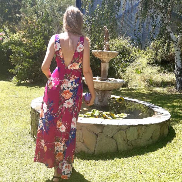 Hermoso Vestido en gasa Schiffon estampado floral y en fondo fucsia , su escote delantero y espalda es en V profundo , pretina en cintura y falda en A , exclusivo de nuestra marca