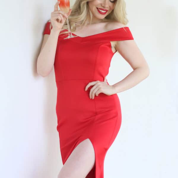 Bello Vestido corte sirena con hombro escotados y abertura en la pierna
