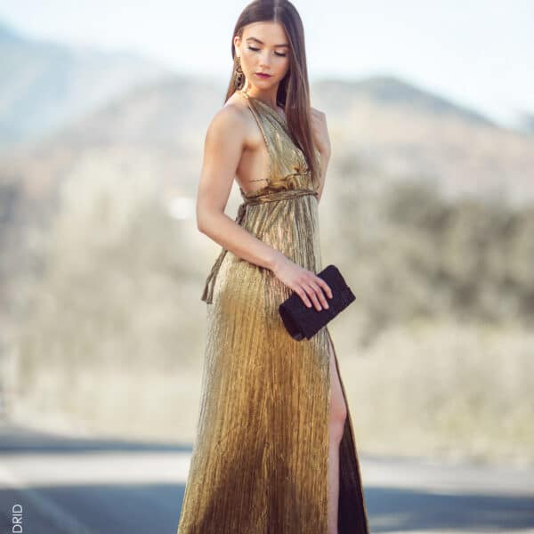Hermosos vestido dorado con tiras multi formas con escote en v pronunciado