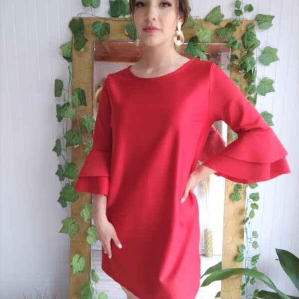 Hermoso y elegante Mini Vestido de silueta trapecio , holgado tipo vestido sesentero , posee mangas vuelo doble , diseño exclusivo de nuestra marca