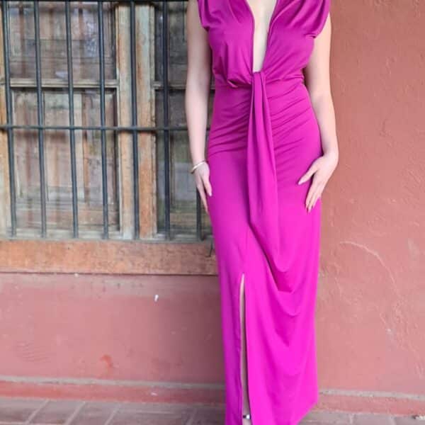Femenino vestido fucsia, con drapeado en el escote y silueta ajustada en la cintura, lleva un lazo decorativo en el centro. Cómodo y elegante.