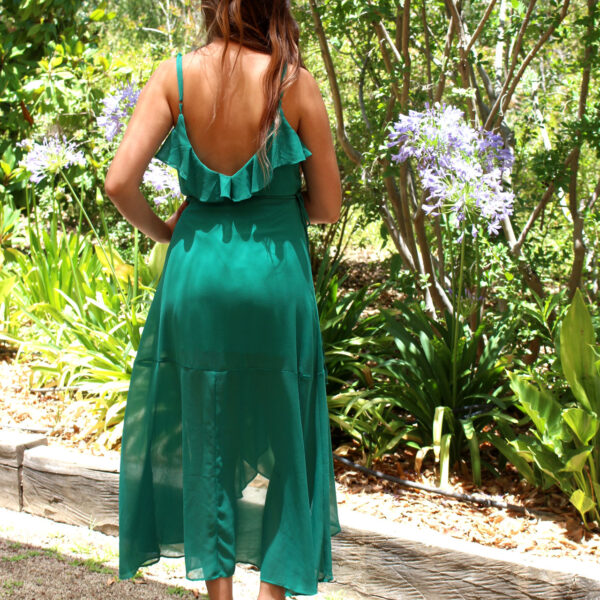 Bello vestido de gasa envolvente ajustable y con vuelos